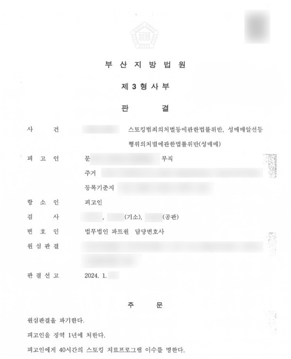 하지만 사건 초기에 법무법인 파트원의 초력을 받아 다양한 양형 조건들을 고려하여 징역 1년, 40시간 스토킹 치료프로그램 이수로 사건을 마무리 할 수 있었습니다.